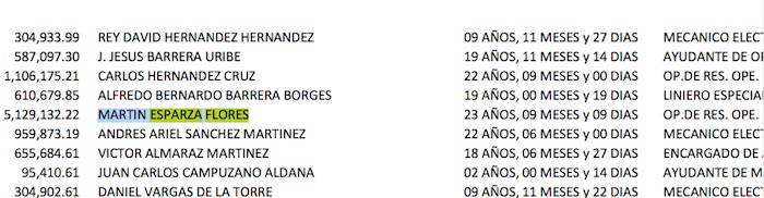 Entre los 14 beneficiados, figuran Roberto Esparza Flores y Pablo Alejandro Esparza Flores, y el chofer de Esparza, Alfonso Becerra Peralta, quienes ingresan cada uno 44 mil 439 pesos mensuales por casi 25 años de antigüedad.