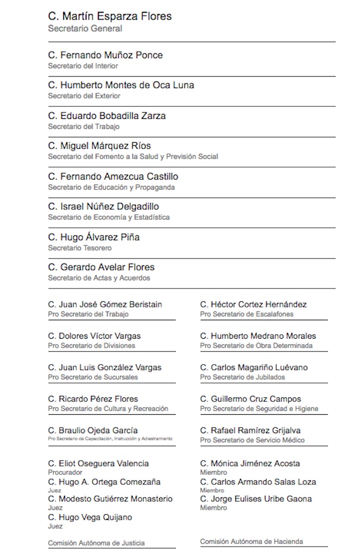 Estos 44 mil trabajadores estaban representados por una dirección sindical que es el Comité Central del SME, integrado por 26 miembros, incluyendo al dirigente Martín Esparza desde 2005. Antes de 2014, el Secretario General se elegía cada dos años con voto directo y secreto, pero -pese a la oposición- se modificaron hasta cinco años por lo que Esparza, reelegido en 2015, podrá estar hasta 2020.