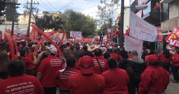 Ciudad de México, 1 de septiembre (SinEmbargo).– Al más puro estilo priista, con matracas, porras, bocinazos, bailables, Arturo Olivares Cerda acudió esta mañana a la sede del Sindicato Nacional de Trabajadores del Instituto Mexicano del Seguro Social (SNTSS) en la colonia Condesa de la Ciudad de México, para registrarse oficialmente como candidato a dirigente nacional.