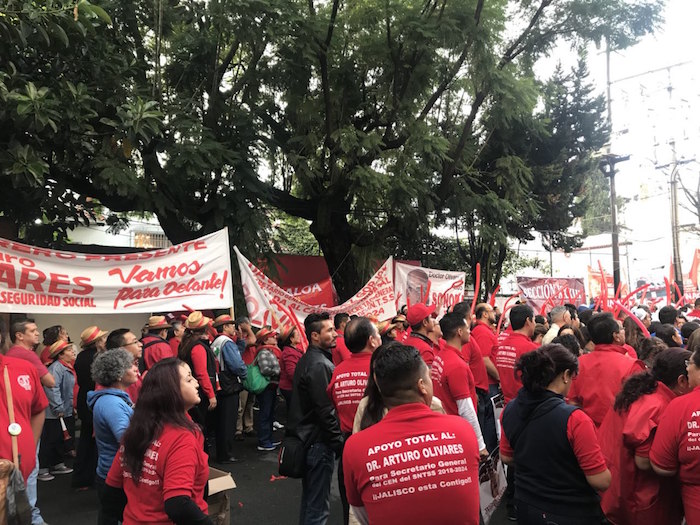 Desde muy temprano, cientos de trabajadores, traídos en autobuses desde distintas partes del país, irrumpieron en las calles de la Condesa para llegar a la sede del SNTSS, situado en Zamora 107, con música, gritos, porras, ataviados además con playeras color rojo PRI, para mostrarle su apoyo al doctor Olivares Cerda.