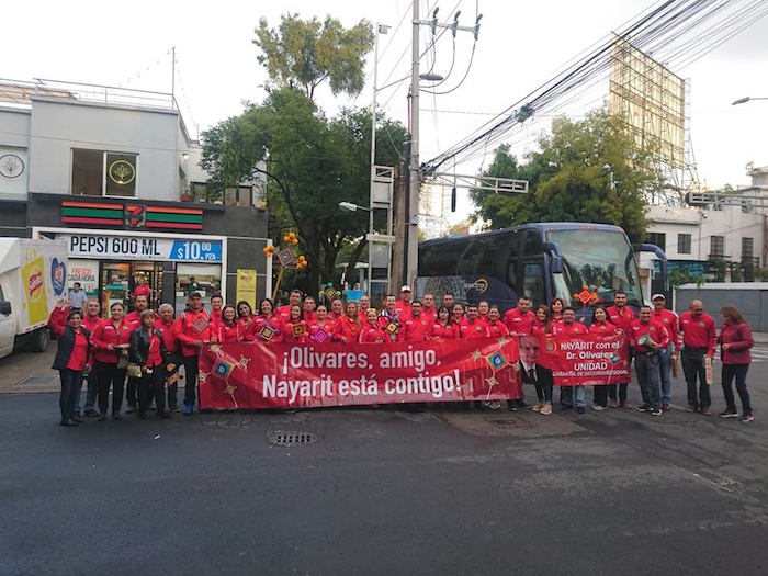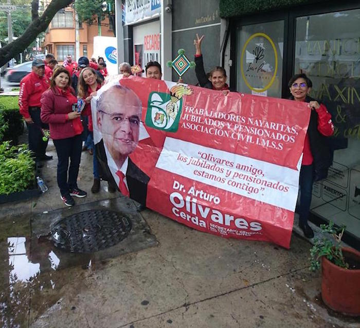Entre los presentes había trabajadores y también ex trabajadores jubilados del IMSS, quienes repetían constantemente el grito: “¡Olivares, Olivares, Olivares!”.