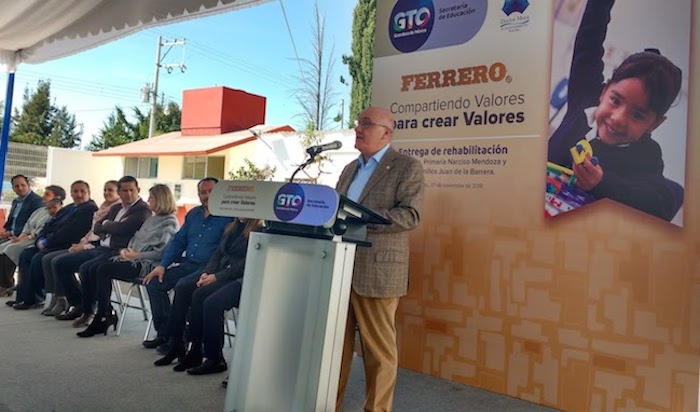 Ciudad de México, 2 de diciembre (SinEmbargo).- La empresa Ferrero entrego la obra de rehabilitación de las escuelas Narciso Mendoza y el jardín de niños Juan de la Barrera que beneficiaran a 120 niños de la comunidad Cerro Chato en Guanajuato.