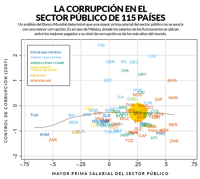 Un análisis del Banco Mundial concluyó que una mayor prima salarial del sector público no se asocia con una menor corrupción. Es el caso de México, donde los salarios de los funcionarios se ubican entre los mejores pagados y su nivel de corrupción es de los más altos del mundo.