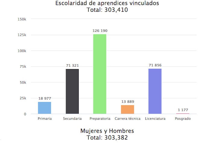 El 15 por ciento de los aprendices vinculados culminó la secundaria, 45 por ciento cuenta con preparatoria o bachillerato terminado, y 29.5 por ciento tiene una carrera universitaria, de acuerdo con las cifras de la Secretaría del Trabajo.