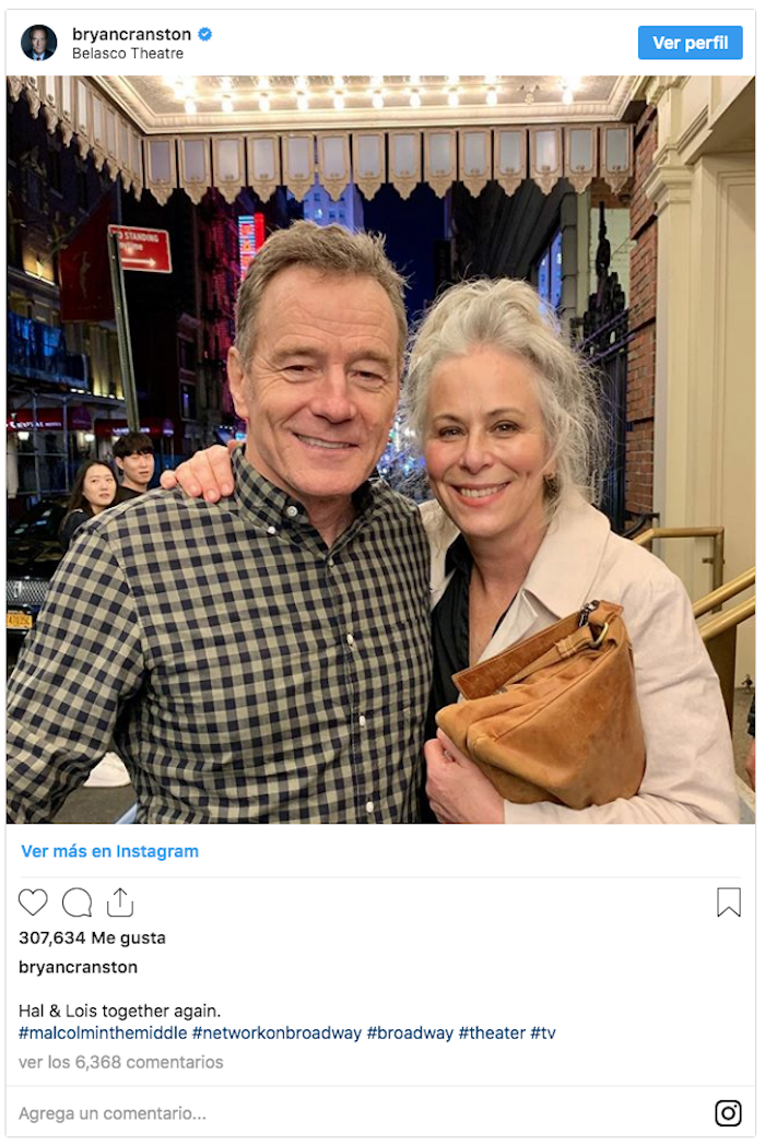 A través de su cuenta de Instagram, Cranston compartió la fotografía con su ex compañera de set. “Hal y Lois juntos otra vez”, escribió debajo de la imagen, la cual fue tomada fuera del Teatro Belasco, en Nueva York.