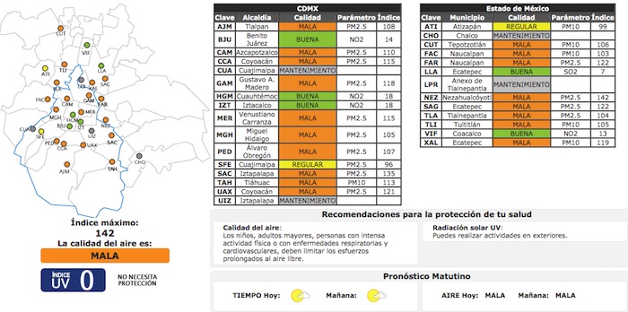 La mala calidad del aire se registra en once de las estaciones con las que cuenta la Ciudad de México; mientras en las estaciones de Benito Juárez, Cuauhtémoc e Iztacalco, la calidad es buena; y en Cuajimalpa es regular.