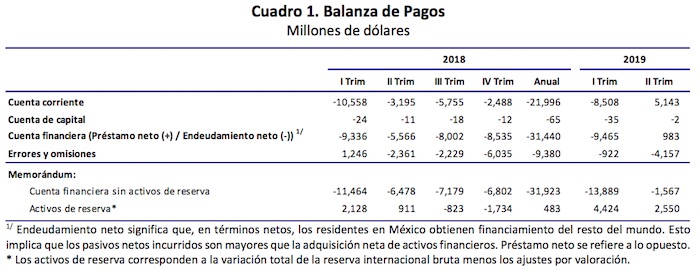 “El segundo trimestre de 2019 la economía mexicana continuó captando recursos por concepto de inversión directa y de otra inversión, si bien el saldo agregado de la cuenta financiera implicó un préstamo neto de México al resto del mundo, explicado por la evolución de la inversión de cartera y los activos de reserva”, afirmó.