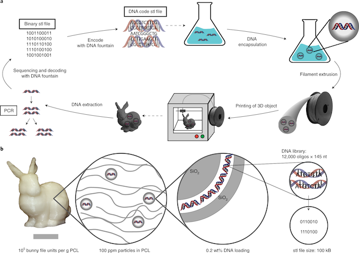 La tecnología desarrollada por el informático israelí Yaniv Erlich puede teóricamente almacenar 215 mil terabytes de datos en un sólo gramo de ADN. A modo de prueba, los investigadores imprimieron en 3D un conejo de plástico que contiene las instrucciones para imprimirlo (cerca de 100 kilobytes de datos), agregando al plástico diminutas perlas de vidrio que contenían ADN con la información.