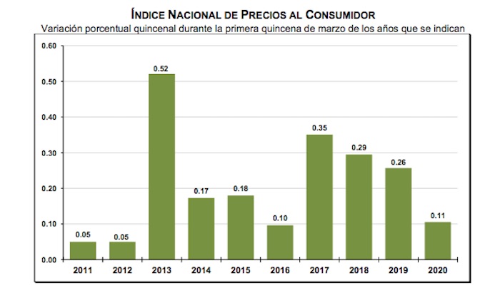 Ciudad de México, 24 de marzo (SinEmbargo).- El Instituto Nacional de Estadística Geografía (Inegi) informó que el Índice de Precios al Consumidor (INPC) presento un alza del 0.11 por ciento, con respecto a la última quincena de febrero.