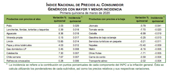 Los productos con mayor nación al alza fueron el limón, con 13.85 por ciento; el aguacate, con 8.36; chile serrano, con 7.67; calabacita, con 7.30; papa y otros tubérculos, con 4.03; pollo, con 2.03, entre otros.