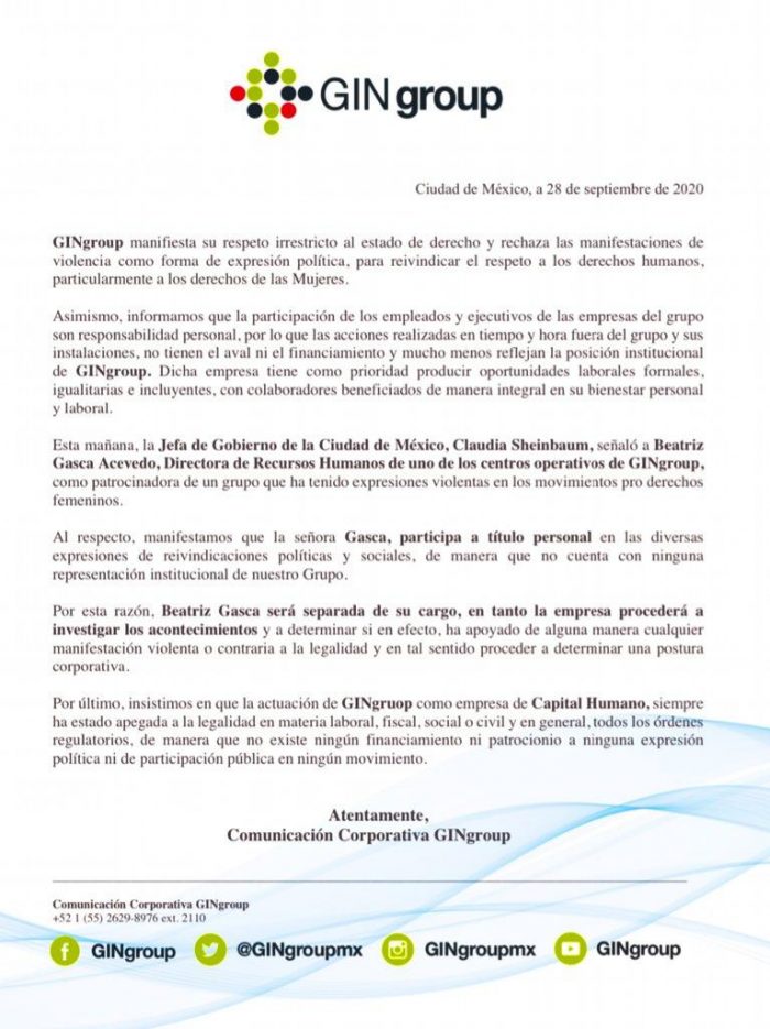 “Informamos que la participación de los empleados y ejecutivos de las empresas del grupo son responsabilidad personal, por lo que las acciones realizadas en tiempo y hora fuera del grupo y sus instalaciones, no tienen el aval ni el financiamiento y mucho menos reflejan la posición institucional de GINgroup”, continuó el documento en el que destacó que la finalidad del conglomerado internacional se basa en otorgar oportunidades laborales igualitarias.