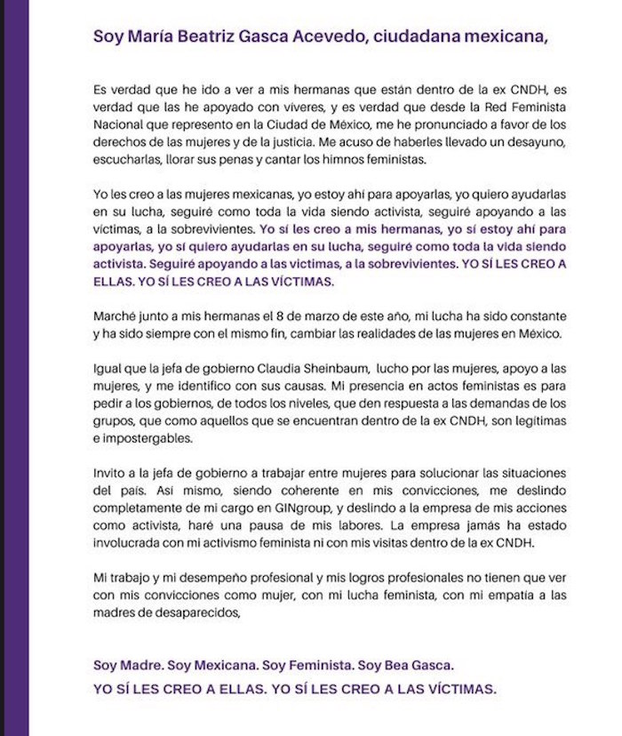 A través de un posicionamiento, la otrora vicepresidente de Responsabilidad Social y Recursos Humanos de GINgroup señaló que sí ha apoyado a las causas feministas, pero negó estar detrás del financiamiento lasa agrupaciones que matoneen la toma de la CNDH en el Centro Histórico.