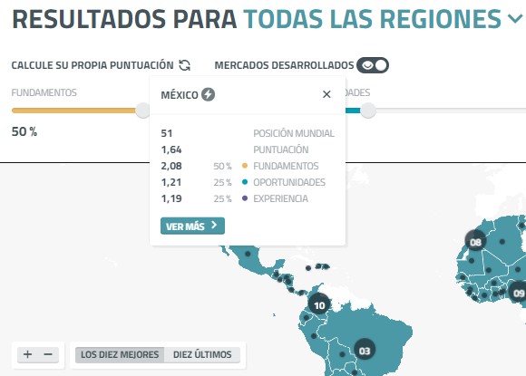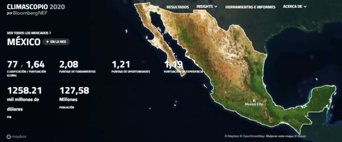 El reporte Climatescope 2020 destacó que entre los mercados energéticos de 108 países emergentes y de de 29 naciones desarrolladas, México se coloca en el 51, después de que el año anterior se ubicara en el sitio 24 del listado y un año antes, en 2018, el puntaje obtenido lo colocó en el octavo puesto.