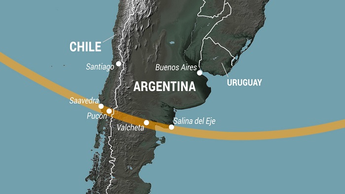 Desde Chile, el eclipse pasará a Argentina de oeste a este por la sureña provincia de Neuquén y el centro de la provincia de Río Negro, para terminar en Salina del Eje, a 800 kilómetros al sur de Buenos Aires.
