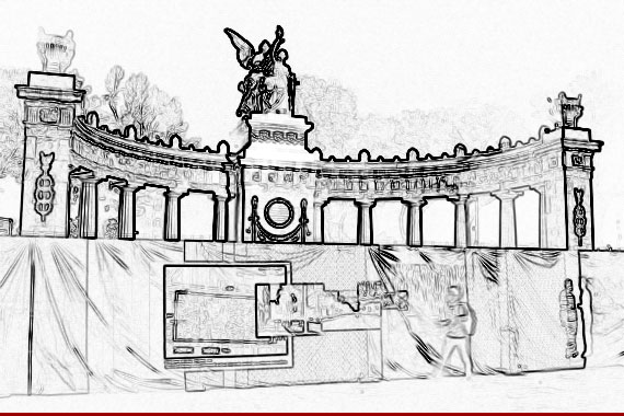Podría ser cualquier ciudad terregosa y disconforme. Hasta que la vista se alza un poco más allá de la extensa cerca de plástico verde, y se encuentra con el Palacio de Bellas Artes. El plástico verde cubre la Alameda Central en remodelación.