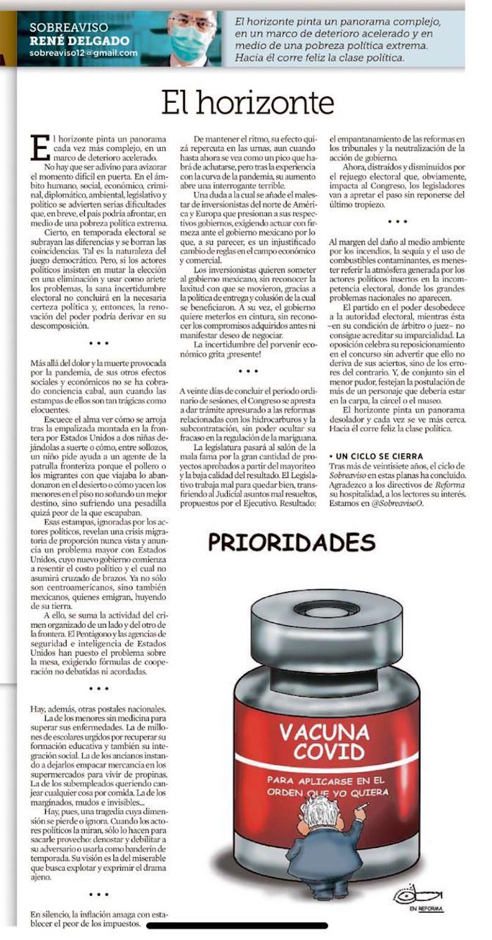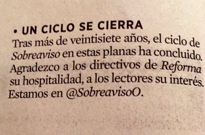 "Tras más de veintisiete años, el ciclo e Sobreaviso en estas planas ha concluido. Agradezco a los directivos de Reforma su hospitalidad, a los lectores su interés. Estamos en @SobreavisoO", expuso.