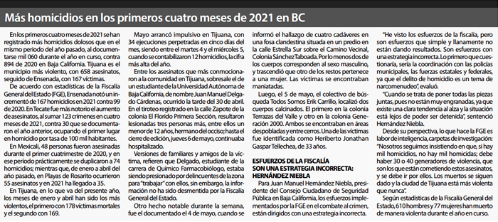 En medio de la reestructuración de los cárteles de la droga en los municipios de la Zona Costa de Baja California, matan a Filiberto Parra, ex operador de “Los Teos”, por afiliarse con Jalisco. En San Quintín, asesinan y amenazan a “Los Oaxacos”, operadores del Cártel de Sinaloa. Presuntos criminales de Jalisco privan de la libertad a policías para obtener información de lealtades criminales de otros agentes. Y ultiman a un estudiante porque creyeron que reactivaba un punto de venta de droga de “Los Chapitos”.
