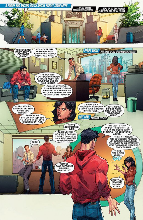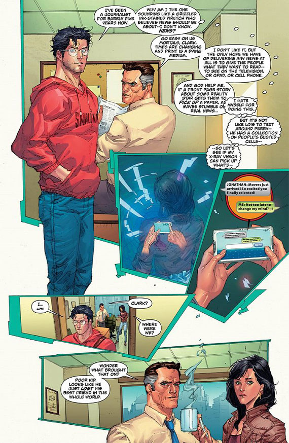 La historia se desarrollará en Superman #13 y salió a la venta hoy en Estados Unidos, tanto en formato impreso como digital. En este número, Clark Kent deja su trabajo en la redacción del Daily Planet y ante el equipo se lamenta de cómo el periodismo se ha visto desbancado por el entretenimiento, un debate que también se ha registrado en muchas redacciones de varios países. Y eso justo coincide con la tendencia de que el diario de Kent haya entrado a formar parte del gran conglomerado empresarial en los medios de comunicación "Galaxy Broadcasting".