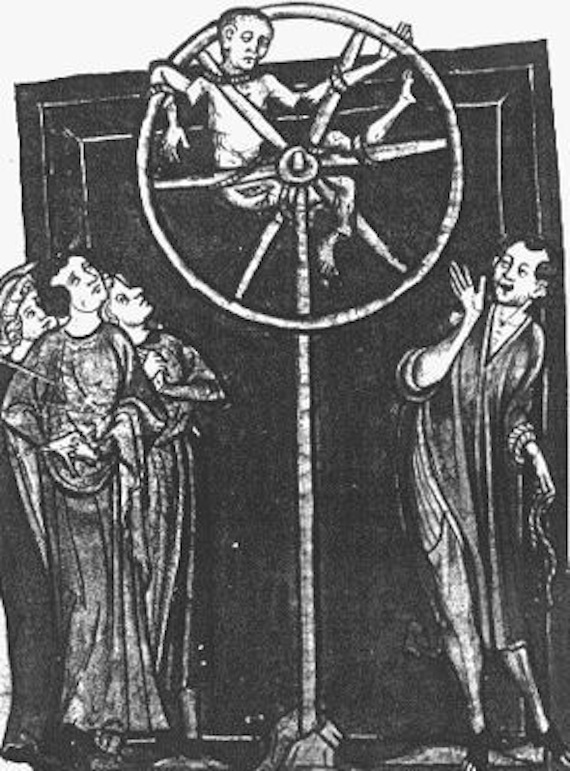 A la víctima normalmente desnuda se le ataban las articulaciones al suelo, fijaban por medio de unas maderas y se le iban destrozando los huesos de estas uno por uno con la brutal rueda de hierro, cuando todos los huesos eran papilla únicamente mantenida por la carne y la piel que los envolvía se le ataba a la rueda para ser expuesto a la muchedumbre, durante días se sobrevivía entre grandes dolores.