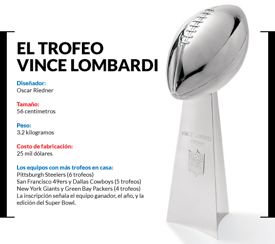 La forma del trofeo presenta un balón reglamentario de fútbol americano en pie realizado con plata. Son dos los trofeos que se fabricarse cuatro meses antes del juego final en la fábrica de Tiffany & Co., en Parsippany, New Jersey, por si uno de ellos resulta dañado durante la celebración