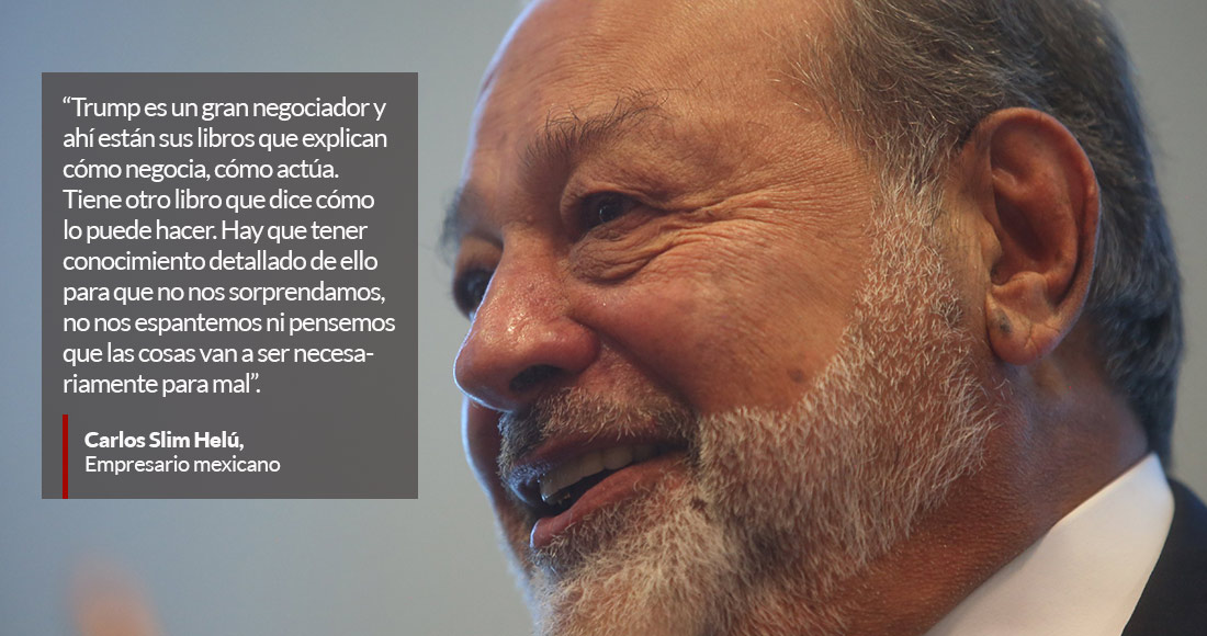 Slim enlistó algunos de los planes de Trump, como la reducción de impuestos, la inversión en infraestructura y crecimiento anual de 4 por ciento. A todo eso, aseguró, van a necesitar mexicanos. “Y eso no es para estar tranquilos, pero nos hace ver que las circunstancias son favorables”, agregó.
