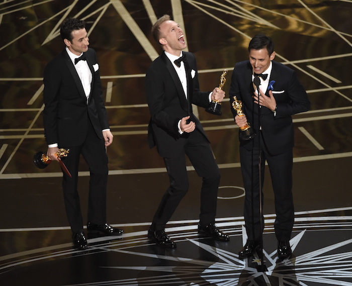 The White Helmets, a cuyos integrantes Raed Saleh y Khaled Khatib se les impidió la entrada a EU por su nacionalidad siria, se llevó el Óscar a mejor corto documental. Los colaboradores que sí pudieron estar presentes en la premiación invitaron a poner "un alto al derramamiento de sangre en Siria, ya basta". Todo el teatro se puso de pie en una gran ovación.