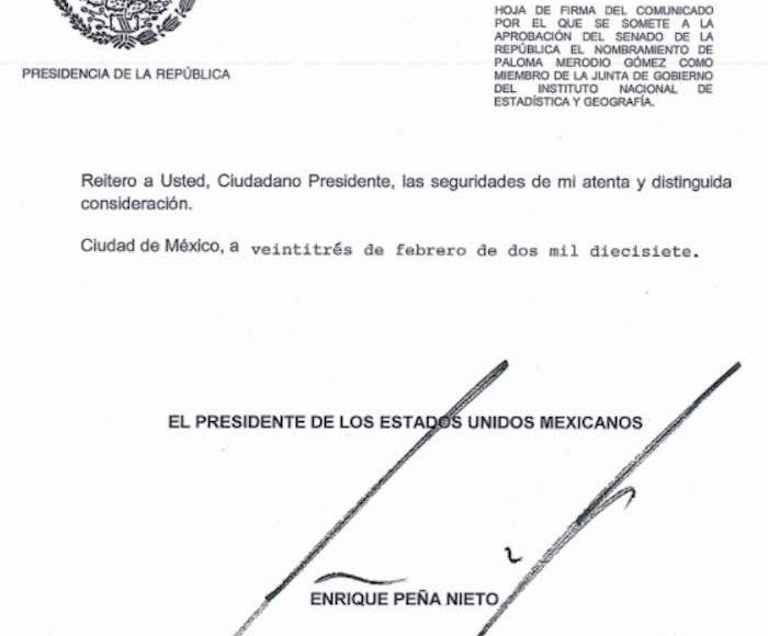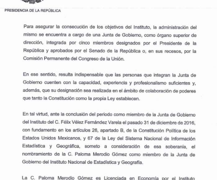 EL DICHO: “La candidata propuesta reúne los requisitos previstos en el artículo 69 de la ley en la materia, lo que puede corroborarse con la documentación que se acompaña […], el Ejecutivo Federal a mi cargo considera que la C. Paloma Merodio Gómez es la persona idónea para que funja como miembro de la Junta de Gobierno del Instituto, por lo que estoy cierto que de contar con la aprobación de esta soberanía, desempeñará tan alta encomienda con plena responsabilidad y en beneficio de nuestro país” (Enrique Peña Nieto, Presidente de la República, 23 de febrero de 2017).