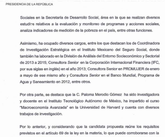 Las mentiras del Presidente: Es innegable que Paloma Merodio Gómez cuenta con un currículum académico nutrido, más si se consideran sus 31 años. Además de sus grados académicos, tiene buena experiencia profesional, entre los que destacan haber sido analista senior en GEA, un grupo de economistas (2007-2010), y actual titular de la Dirección General de Evaluación y Monitoreo de los Programas Sociales de la Sedesol. Sin embargo, la información turnada por la Presidencia de la República a la Jucopo está inflada: lo que pone como cargos, en muchos casos, fueron pasantías. Y miente, ya que ostenta a Merodio como “investigadora y docente en el ITAM”, además de mencionar que “ha impartido el curso ‘Macroeconomía Avanzada’ en la Universidad de Harvard”. La realidad es que Merodio fue asistente de profesor en varias ocasiones, no una académica invitada o una docente titular de una materia. En ese sentido, la mentira se basa en la ambigüedad de la información, y esas “imprecisiones”, para los senadores, dirimen la legitimidad de la candidata.