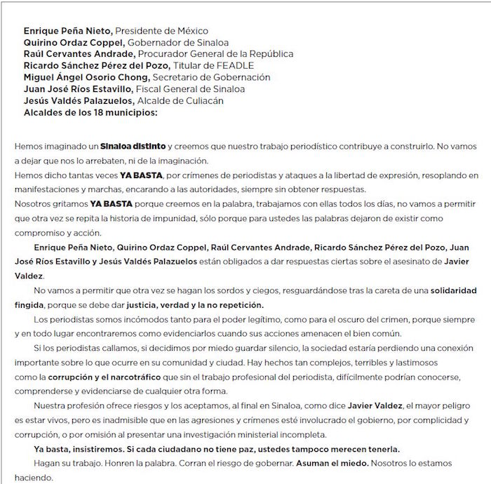En la carta los periodistas señalaron que es necesario que en el caso de Valdez Cárdenas se dé justicia y verdad, y que además se garantice que no vuelva a suceder otro asesinato contra periodistas en Sinaloa o en otra entidad del País.