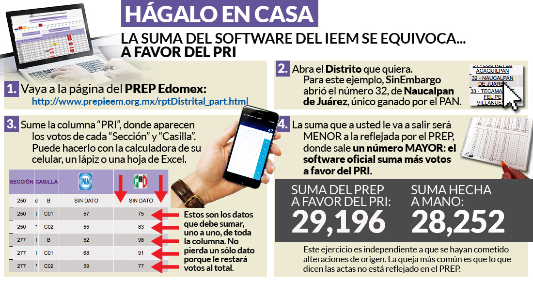 Los votos registrados en las actas fotografiadas –y subidas a redes sociales por los usuarios– no concuerdan con lo reportado por el PREP, que pone como virtual ganador de la contienda del pasado 4 de junio a Alfredo del Mazo con 33 por ciento de los sufragios, frente al 31 por ciento de Delfina Gómez Álvarez, candidata de Movimiento Regeneración Nacional (Morena).