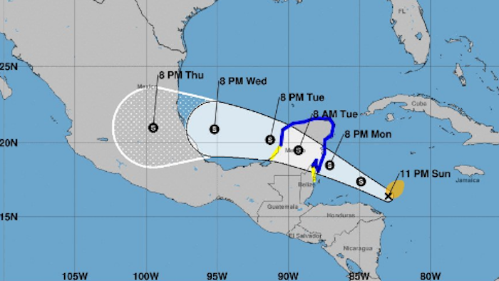Los meteorólogos del CNH, con sede en Miami, advirtieron de que el sistema podría alcanzar fuerza de huracán antes de tocar tierra en la costa de Yucatán, para luego debilitarse mientras atraviesa la península el martes.