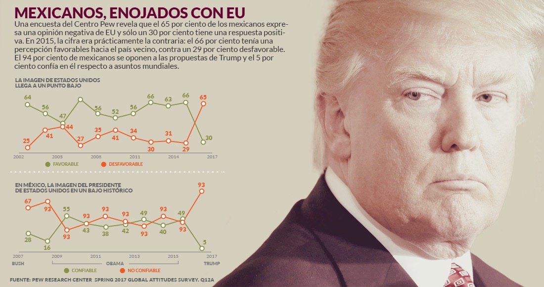 Las declaraciones del Presidente Donald Trump y sus políticas han llegado a un punto difícil no sólo a nivel diplomático. Por primera vez en más de un cuarto de siglo, la mayoría de los mexicanos tienen opiniones negativas hacia los Estados Unidos, de acuerdo con las encuestas recopilados por la firma mexicana Buendía & Laredo en colaboración con el Consejo de Asuntos Exteriores de Chicago y el Centro Internacional para Académicos Woodrow Wilson.