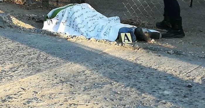 A las 7:45 llegaron al lugar policías estatales, municipales y soldados del Ejército. El cuerpo estaba cubierto con un pedazo de manta blanca en la que estaba escrito un narcomensaje dirigido a mandos del Ejército.