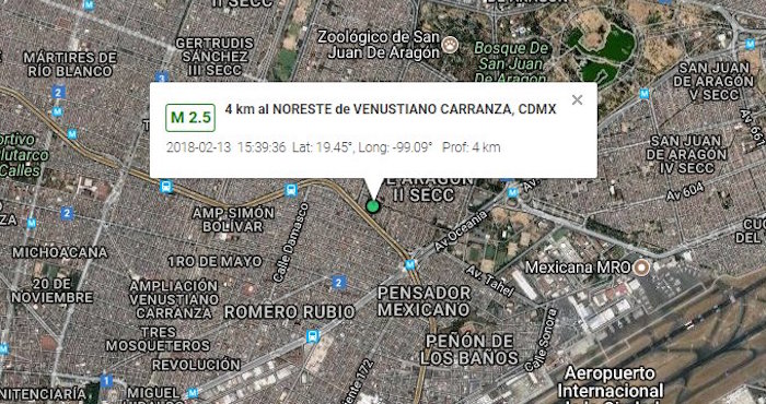 Ciudad de México, 13 de febrero (SinEmbargo).- Un sismo de magnitud 2.5 se registró esta tarde con epicentro la delegación Venustiano Carranza, en la Ciudad de México, hasta el momento sin ningún incidente registrado.