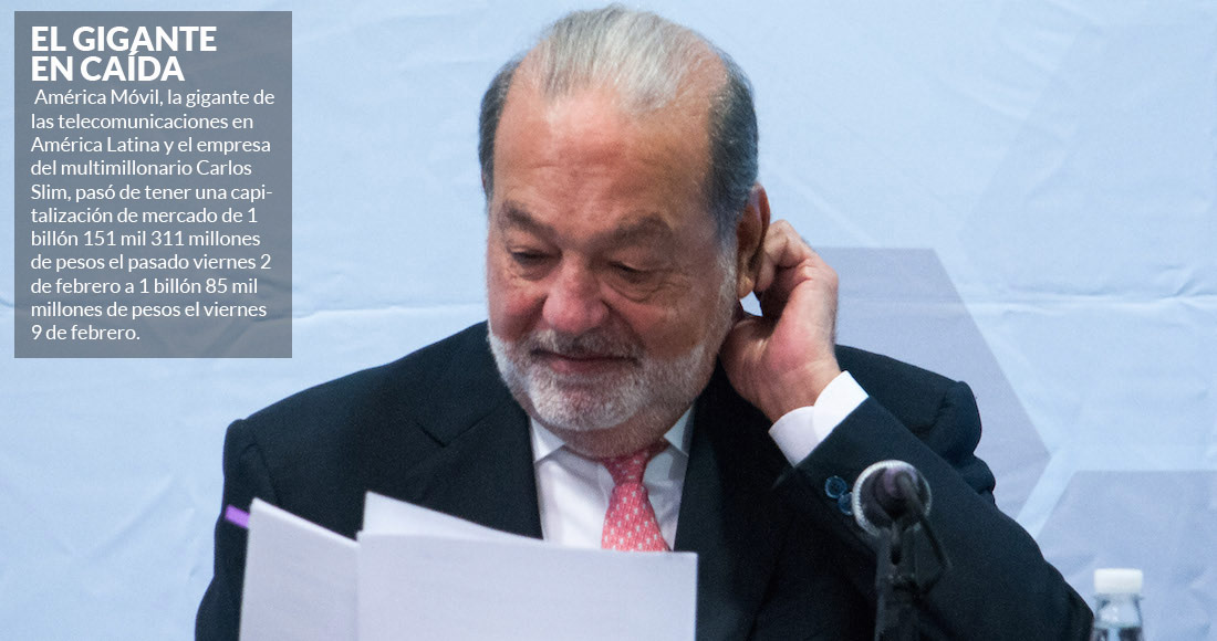 En la "semana negra" de los mercados globales que se registró entre el 2 y el 9 de febrero, América Móvil tuvo una caída de 5.75 por ciento en su capitalización de mercado, equivalente a 66 mil 311 millones de pesos, al pasar de 1 billón 151 mil 311 millones de pesos a 1 billón 85 mil millones en tan solo siete días.