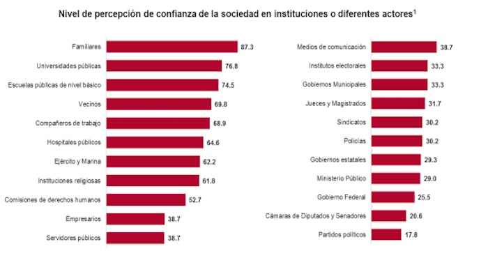 Esta encuesta, que se realiza cada dos años, muestra que los mexicanos confían más en sus familiares, así como en las universidades públicas, con 87.3 por ciento y 76.8 por ciento respectivamente. Por otro lado, el menor grado de confianza se presentó en los partidos políticos con 17.8 por ciento.