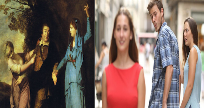 Un usuario de Twitter compartió el parecido que existe entre el cuadro Garrick entre la tragedia y la comedia, de un pintor inglés, y el meme del "novio distraído" que se hizo viral en Internet el año pasado.