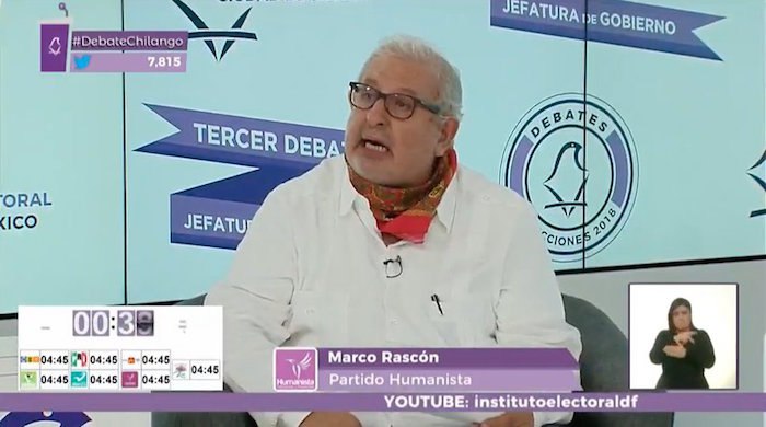 Marco Rascón dijo en su mensaje final que gracias a Felipe Calderón y López Obrador regresó el PRI y señaló a Mikel Arriola. Pidió el voto por los candidatos del Partido Humanista, por la ex aspirante presidencial María de Jesús Patricio Martínez, "Marichuy", y "si les da tiempo, voten por Marco Rascón".