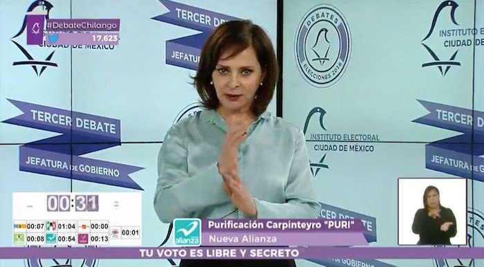 Purificación Carpinteyro se despidió del debate al comentar que ningún menor de edad carecerá de servicios de salud, también aplicará una comisión para vigilar todo el dinero que manejara, además sacará 70 convoyes de Metro que están arrumbados. Soy la candidata de los maestros, de los buenos maestros, insistió, y también dijo que es un honor representar a Nueva Alianza.