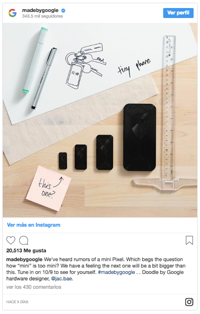 En ese mensaje, el gigante de Internet ha compartido una fotografía en la que aparecen cuatro presuntos modelos de la gama Pixel y un boceto que en el que el de menor tamaño permitiría ejercer como objeto para portar llaves.