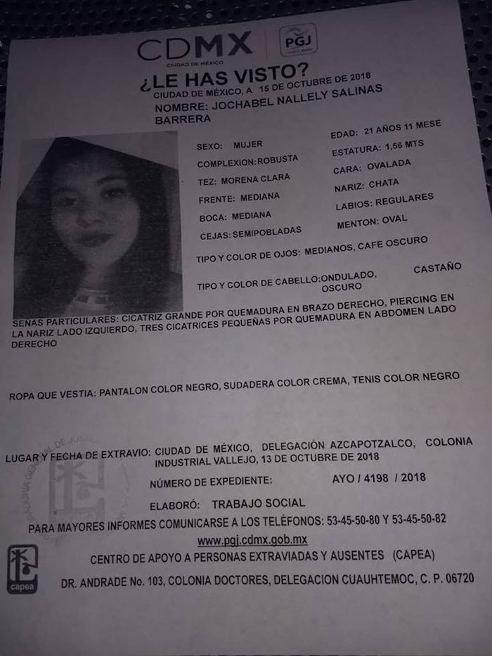 Jochabel Nallely Salinas Barrera fue vista por última vez en la colonia Industrial Vallejo, en la Ciudad de México.