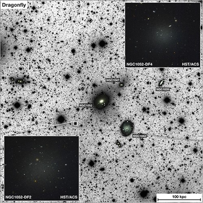 En el primer estudio, el equipo confirmó sus observaciones iniciales de NGC 1052-DF2, o DF2 para abreviar, que muestran que la materia oscura está prácticamente ausente en la galaxia. Utilizando el Keck Cosmic Web Imager (KCWI) del Observatorio W. M. Keck, reunieron mediciones más precisas y encontraron que los cúmulos globulares dentro de la galaxia se están moviendo a una velocidad consistente con la masa de la materia normal de la galaxia. Si hubiera materia oscura en DF2, los grupos se moverían mucho más rápido.