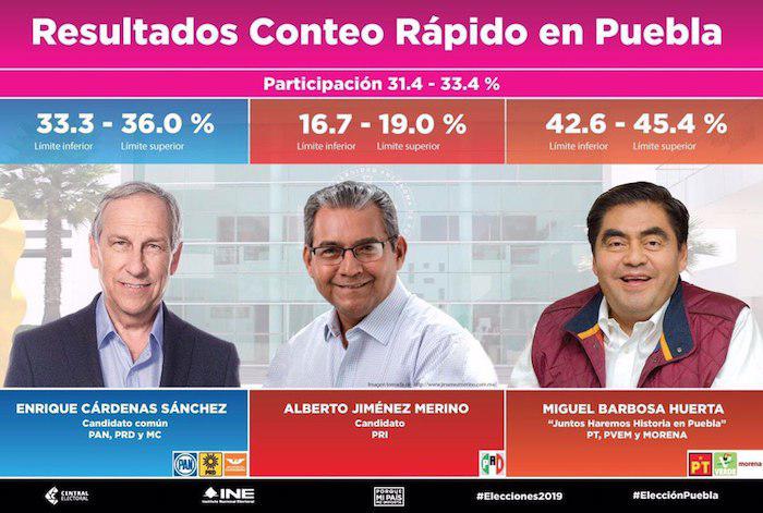 El conteo rápido del INE reportó que Miguel Barbosa (Morena-PT-PVEM) lleva una ventaja de entre 42.6 y 45.4 por ciento de las preferencias; seguido de Enrique Cárdenas (PAN-PRD-MC), con 33.3 y 36 por ciento de las preferencias. Alberto Jiménez (PRI) se coloca en el tercer sitio con un límite máximo 19 por ciento y un mínimo de 17.