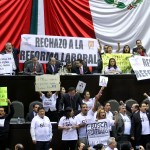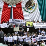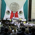 Antes, integrantes del Movimiento de Regeneración Nacional (Morena) se introdujeron al Palacio Legislativo de San Lázaro y llegaron a unos metros del salón de plenos para lanzar consignas contra los legisladores del PRI y PAN.