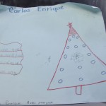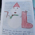Otro de los dibujos muestra un obeso hombre de nieve con una bota navideña y una especie de caramelo gigante en cada mano. Sobre su cabeza un gorro rojo. En su cuello cuelga una bufanda verde. En la parte inferior de la cartulina, Paola, la autora del dibujo, escribe: “Yo deseo que me compren una mini laptop y que haya paz en el pueblo no queremos vivir más aterrados”.