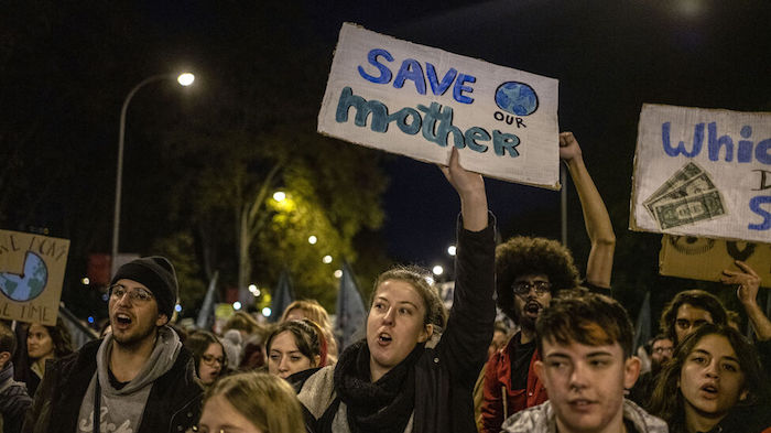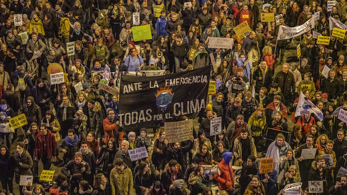 Parte de los asistentes a la Marcha por el Clima alertan en sus pancartas del estado de emergencia en el que se encuentra el planeta. Foto: Olmo Calvo, ElDiarioES