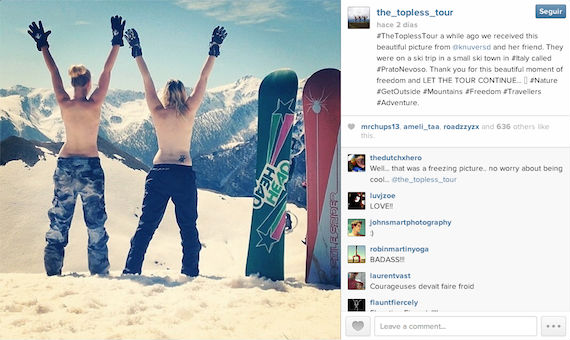 Mediante la etiqueta #TheToplessTour se puede acceder a este acervo fotográfico de reciente creación que ya acumula más de 200 imágenes, mismas que se mantienen al margen de la censura, dado que no se trata de desnudos frontales que ambas plataformas virtuales condenan y tantos reclamos han recibido por parte de usuarios de la red que pugnan por más libertad en sus publicaciones.
