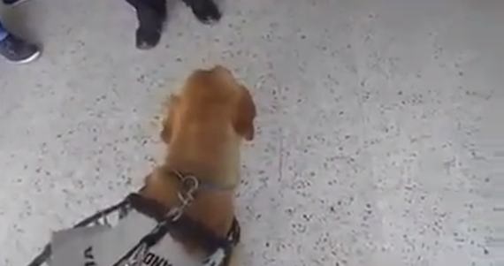 "Es un perro guía, que no sabe leer", señala el hombre, a lo que la policía responde violentamente "¿y usted sabe ver, usted sabe ver o no sabe ver estúpido?", posteriormente comienza a golpearlo y aventarlo.