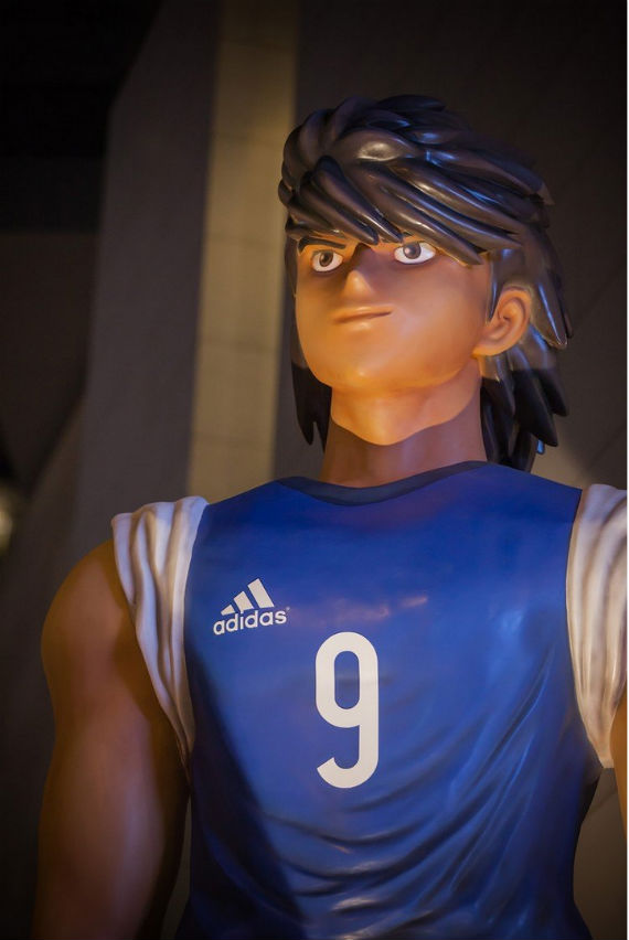 Entre las estatuas se encuentra Oliver Atom (Tsubasa Ozora, 麥泰萊), Tom Misaki (Taro Misaki, 戴志偉), Benji Price (Genzo Wakabayashi, 林源三) y Steve Hyuga (Kojiro Hyuga, 小志強) portando los últimos modelos de zapatillas y equipamiento Adidas de los Samuráis Azules, apodo con el que se conoce popularmente a la Selección de Fútbol de Japón. La exposición se encuentra en el centro comercial Plaza Hyasan y el Lee Theatre, en donde las figuras gigantes aparecen acompañadas por ilustraciones de la serie y una enorme réplica de la pelota oficial que será utilizada este año para el Mundial.
