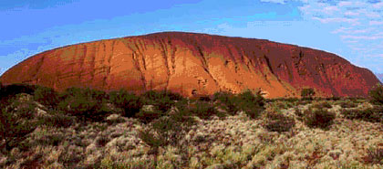 Esta es la gran formación de piedra arenisca de Ayers Rock, también conocida como Uluru, su altura es de 348 metros sobre el nivel del desierto. Es el monolito icónico de ese continente.